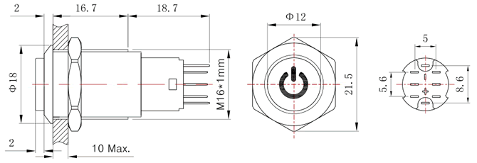 系列商品:FT16按钮开关 模型号:FT16Q-C36 订单型号:FT16QB-H11Z/V 安装孔径:Φ16mm 头部形状:高平头 电源符号灯 开关结构:1NO1NC / 2NO2NC 操作类型:复位 / 自锁 尾部配置:引脚式 开关规格:3A 250VAC 防护等级:IP65 / IP67 灯珠颜色:红 黄 绿 蓝 白 (可定制其他颜色) 灯珠电压:2V 3V 5V 6V 12V 24V 36V 48V 灯珠电压:110V 220V (大于48V时需接外接电阻) 灯珠电流:15mA(≤48V);2mA(≥110V)