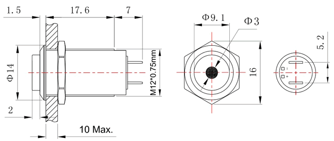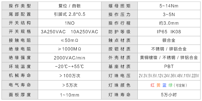 系列商品:FT12按钮开关 模型号:FT12Q-D11 订单型号:FT12QC-H10Z/D 安装孔径:Φ12mm 头部形状:高平头 点带灯 开关结构:1NO 操作类型:复位 / 自锁 尾部配置:引脚式 开关规格:3A 250VAC / 10A 250VAC 防护等级:IP65 灯珠颜色:红 黄 绿 蓝 (可定制其他颜色) 灯珠电压:2V 3V 5V 6V 12V 24V 36V 48V 灯珠电压:110V 220V (大于3V时需接外接电阻) 灯珠电流:15mA(≤48V);2mA(≥110V)