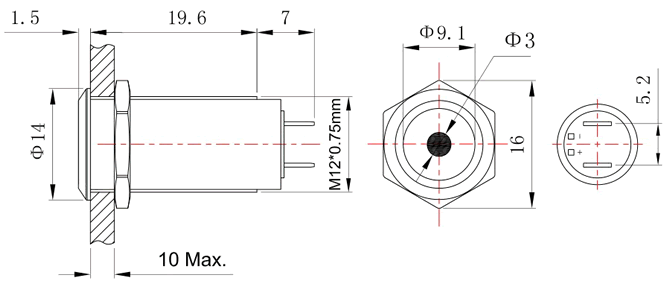 系列商品:FT12按钮开关 模型号:FT12Q-D12 订单型号:FT12QC-F10Z/D 安装孔径:Φ12mm 头部形状:平头 点带灯 开关结构:1NO 操作类型:复位 / 自锁 尾部配置:引脚式 开关规格:3A 250VAC / 10A 250VAC 防护等级:IP65 灯珠颜色:红 黄 绿 蓝 (可定制其他颜色) 灯珠电压:2V 3V 5V 6V 12V 24V 36V 48V 灯珠电压:110V 220V (大于3V时需接外接电阻) 灯珠电流:15mA(≤48V);2mA(≥110V)