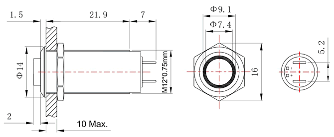 系列商品:FT12按钮开关 模型号:FT12Q-D15 订单型号:FT12QC-H10Z/E 安装孔径:Φ12mm 头部形状:高平头 环形灯 开关结构:1NO 操作类型:复位 / 自锁 尾部配置:引脚式 开关规格:3A 250VAC / 10A 250VAC 防护等级:IP65 灯珠颜色:红 黄 绿 蓝 (可定制其他颜色) 灯珠电压:2V 3V 5V 6V 12V 24V 36V 48V 灯珠电压:110V 220V (大于3V时需接外接电阻) 灯珠电流:15mA(≤48V);2mA(≥110V)