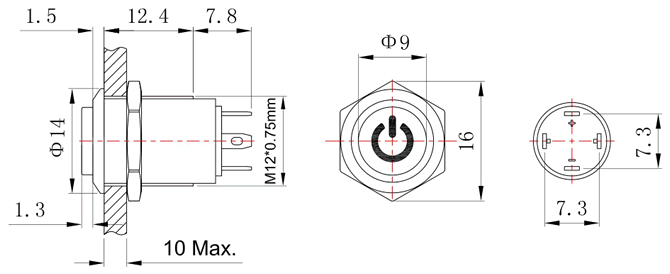 系列商品:FT12按钮开关 模型号:FT12Q-D30 订单型号:FT12QB-H10/V 安装孔径:Φ12mm 头部形状:高平头 电源符号灯 开关结构:1NO 操作类型:复位 尾部配置:引脚式 开关规格:2A 250VAC / 2A 36VDC / 3A 250VAC 防护等级:IP65 灯珠颜色:红 黄 绿 蓝 白 (可定制其他颜色) 灯珠电压:2V 3V 5V 6V 12V 24V 36V 48V 灯珠电压:110V 220V (大于3V时需接外接电阻) 灯珠电流:15mA(≤48V);2mA(≥110V)