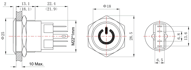 系列商品:FT22按钮开关 模型号:FT22Q-H22/H23Z 订单型号:FT22QB-F11Z/V 安装孔径:Φ22mm 头部形状:平头 电源符号灯 开关结构:1NO1NC 操作类型:复位 / 自锁 尾部配置:引脚式 开关规格:5A 250VAC 防护等级:IP65 / IP67 灯珠颜色:红 黄 绿 蓝 白 (可定制其他颜色) 灯珠电压:2V 3V 5V 6V 12V 24V 36V 48V 灯珠电压:110V 220V 灯珠电流:15mA(≤48V);2mA(≥110V)