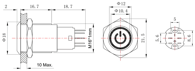 系列商品:FT16按钮开关 模型号:FT16Q-C18A 订单型号:FT16QB-C18A 安装孔径:Φ16mm 头部形状:平头 环形+电源符号灯 开关结构:1NO1NC / 2NO2NC 操作类型:复位 / 自锁 尾部配置:引脚式 开关规格:3A 250VAC 防护等级:IP65 / IP67 灯珠颜色:红 黄 绿 蓝 白 (可定制其他颜色) 灯珠电压:2V 3V 5V 6V 12V 24V 36V 48V 灯珠电压:110V 220V (大于48V时需接外接电阻) 灯珠电流:15mA(≤48V);2mA(≥110V)