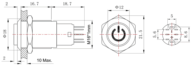 系列商品:FT16按钮开关 模型号:FT16Q-C19A 订单型号:FT16QB-C19A 安装孔径:Φ16mm 头部形状:平头 电源符号灯 开关结构:1NO1NC / 2NO2NC 操作类型:复位 / 自锁 尾部配置:引脚式 开关规格:3A 250VAC 防护等级:IP65 / IP67 灯珠颜色:红 黄 绿 蓝 白 (可定制其他颜色) 灯珠电压:2V 3V 5V 6V 12V 24V 36V 48V 灯珠电压:110V 220V (大于48V时需接外接电阻) 灯珠电流:15mA(≤48V);2mA(≥110V)